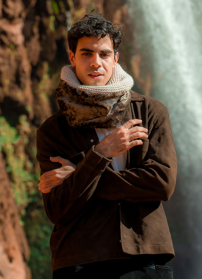 Elevate your style with the Champagne Shine Eco Fur Snood. Featuring shimmering champagne eco fur with natural waves and a nude knit lining, it radiates luminous elegance.