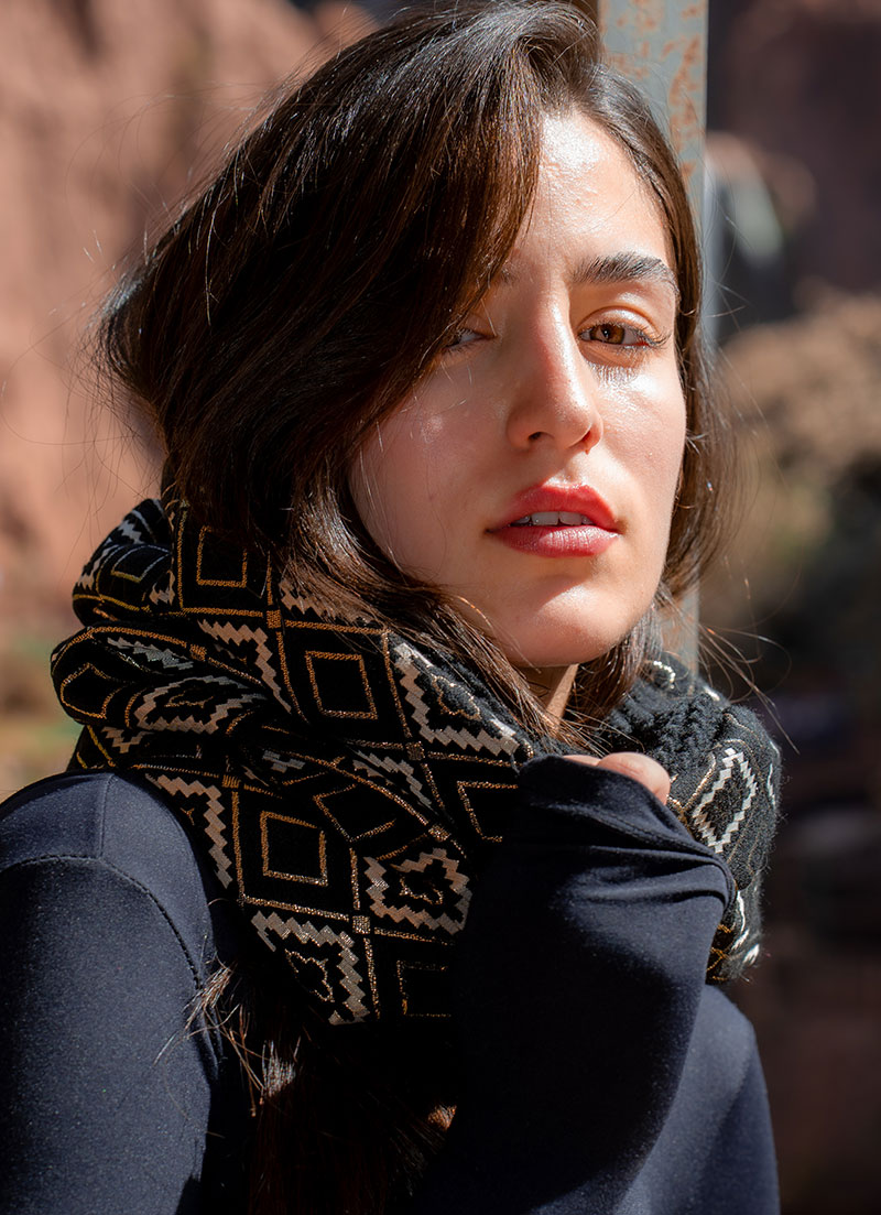 Make a graphic statement with the Geometric Diamond Snood. Featuring repeating diamond motifs in metallic threads, this design merges timeless geometry with modern refinement.