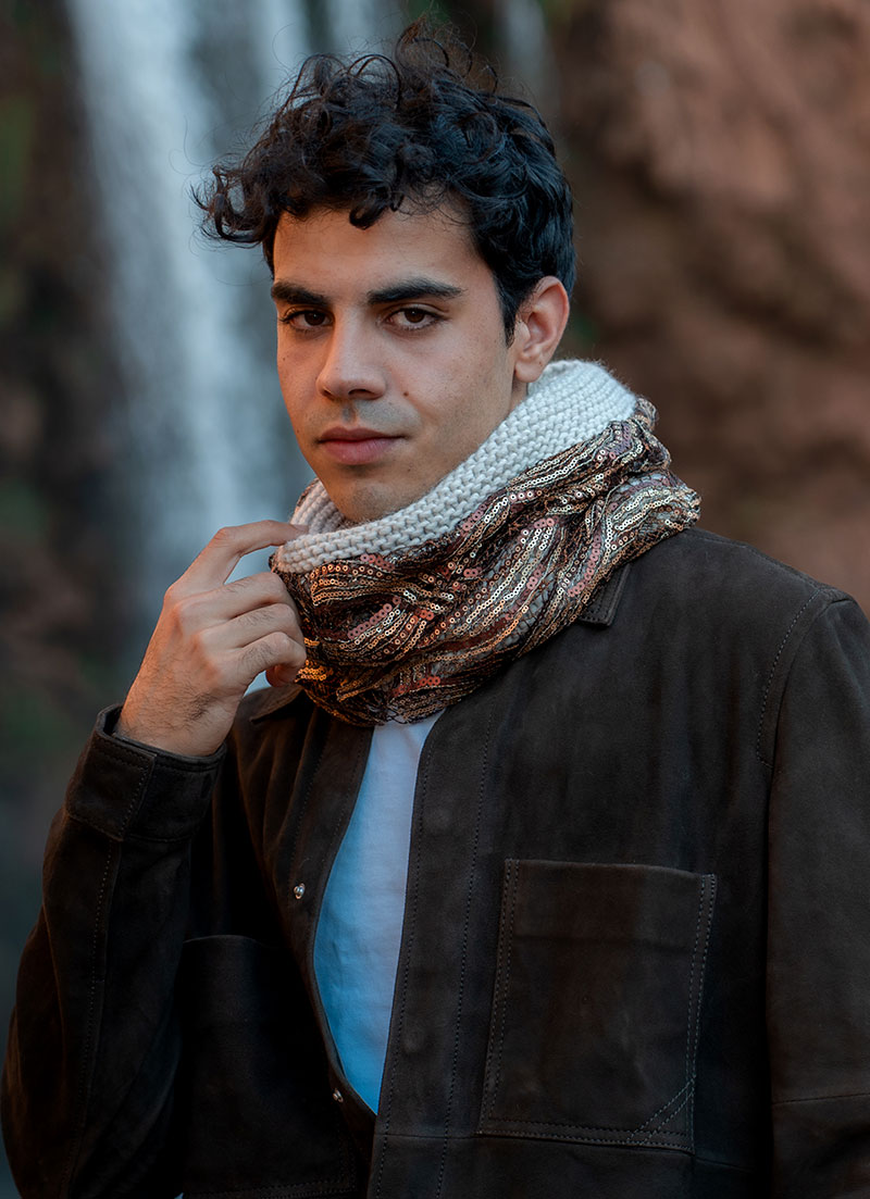 Delicate and ethereal, the Golden Whisper Snood is crafted from sheer mesh, entirely hand-embroidered with golden threads and sequins. Its transparent design reveals the nude knit lining beneath, creating a luminous layered effect.