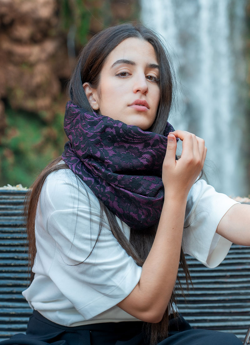 Unveil the allure of contrast with the Magenta Veil Lace Snood. Black lace overlays a magenta base, creating a mysterious depth that radiates dark romance.