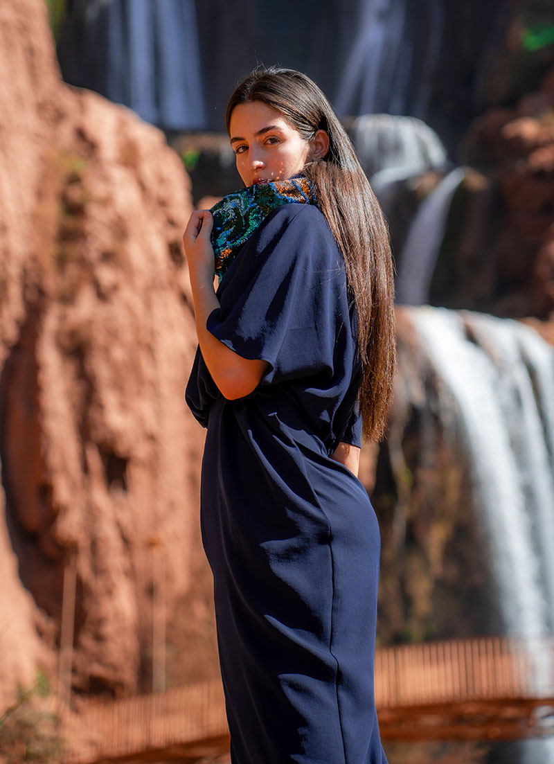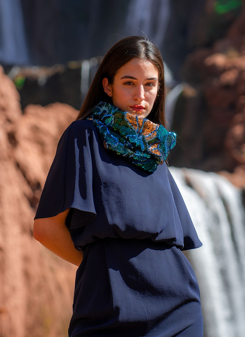 Lined with soft midnight blue knit, this snood combines warmth with artisanal beauty, making it a true showpiece of craftsmanship.