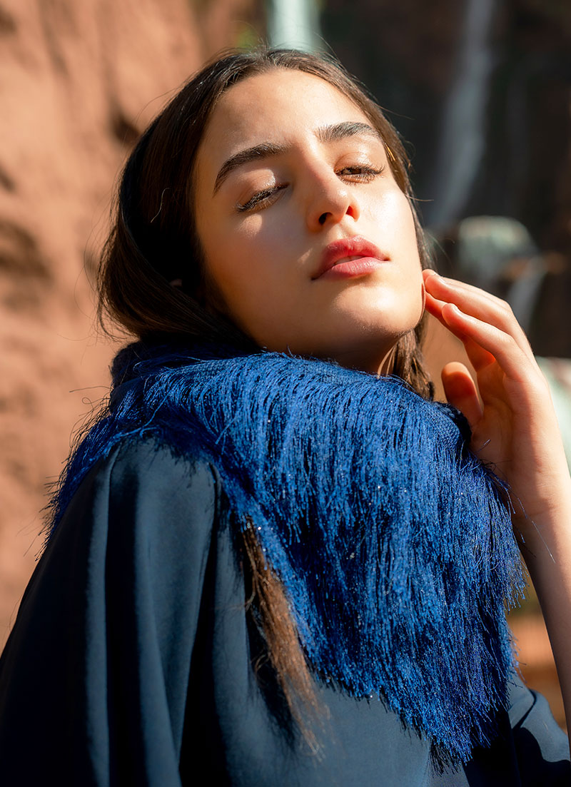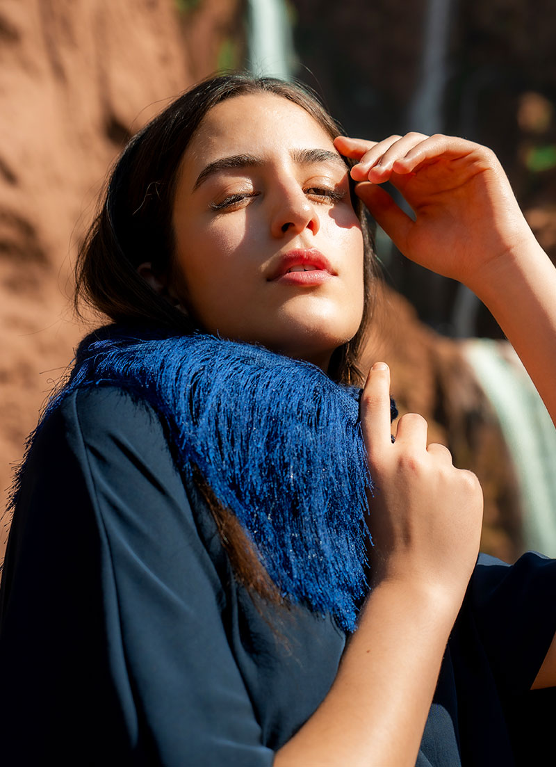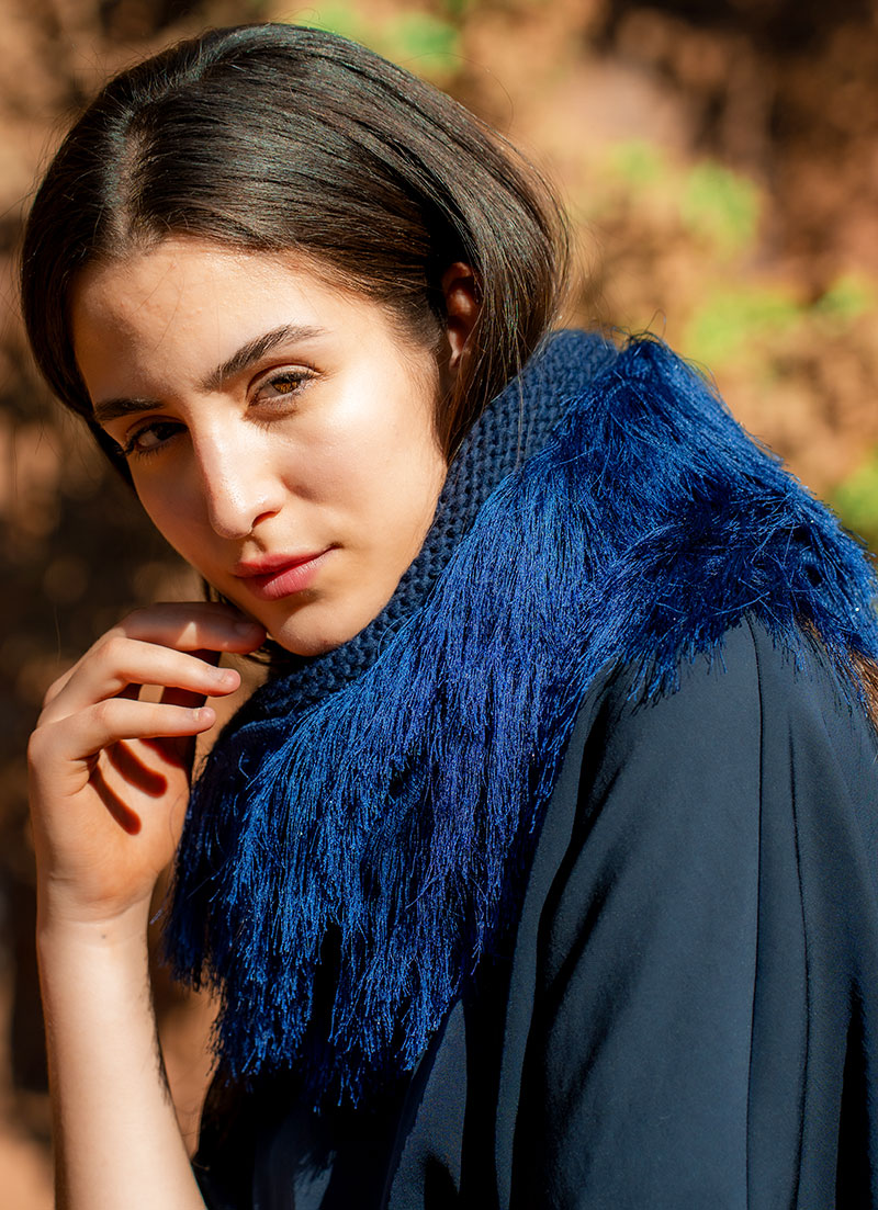 Dive into opulence with the Sapphire Luxe Fringe Snood. Crafted with radiant blue fringes that shimmer in motion, it brings jewel-like vibrancy to winter styling.