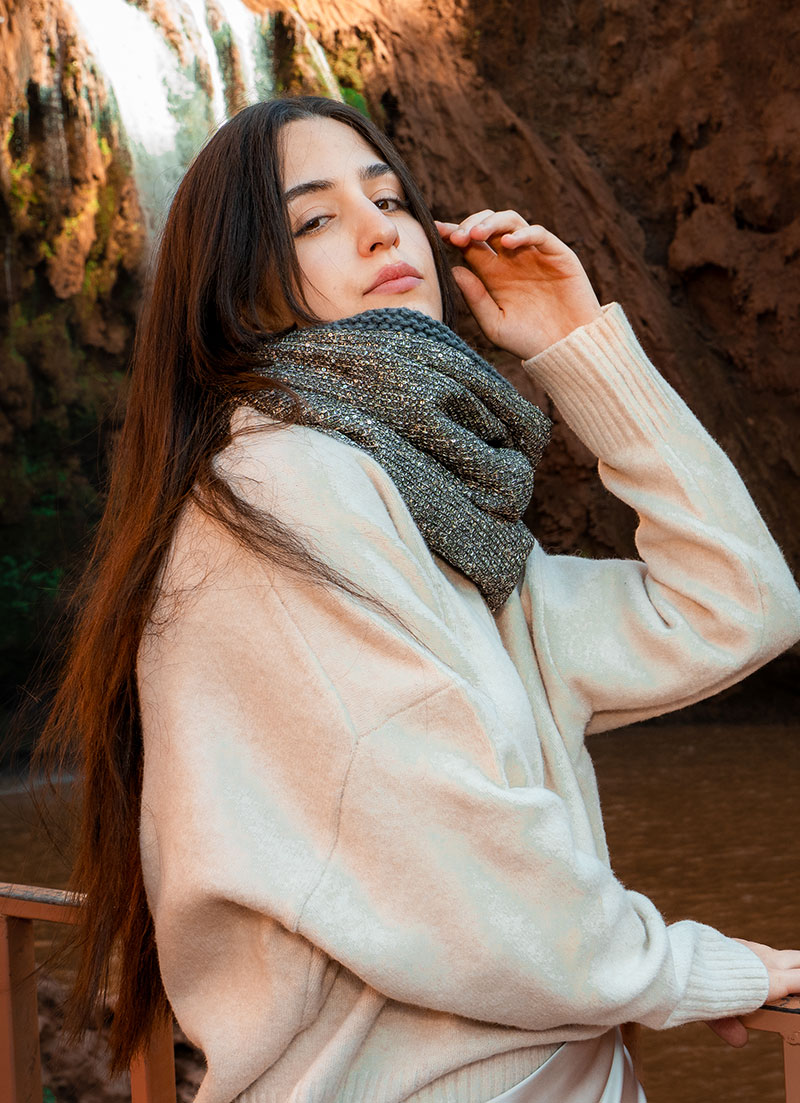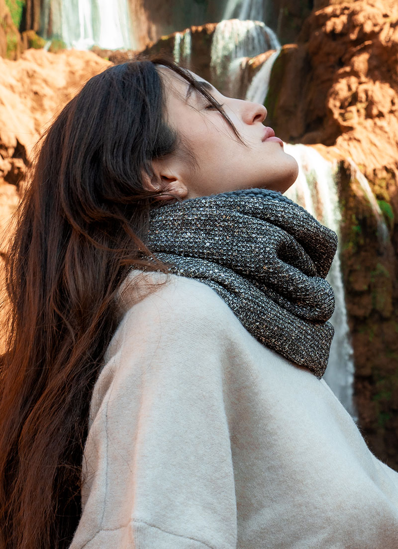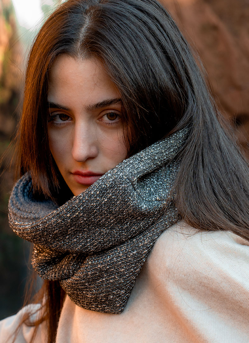 Discover understated elegance with the Twilight Spark Knit Snood. A refined knit is lightly embellished with subtle sequins, offering a soft shimmer reminiscent of twilight light.